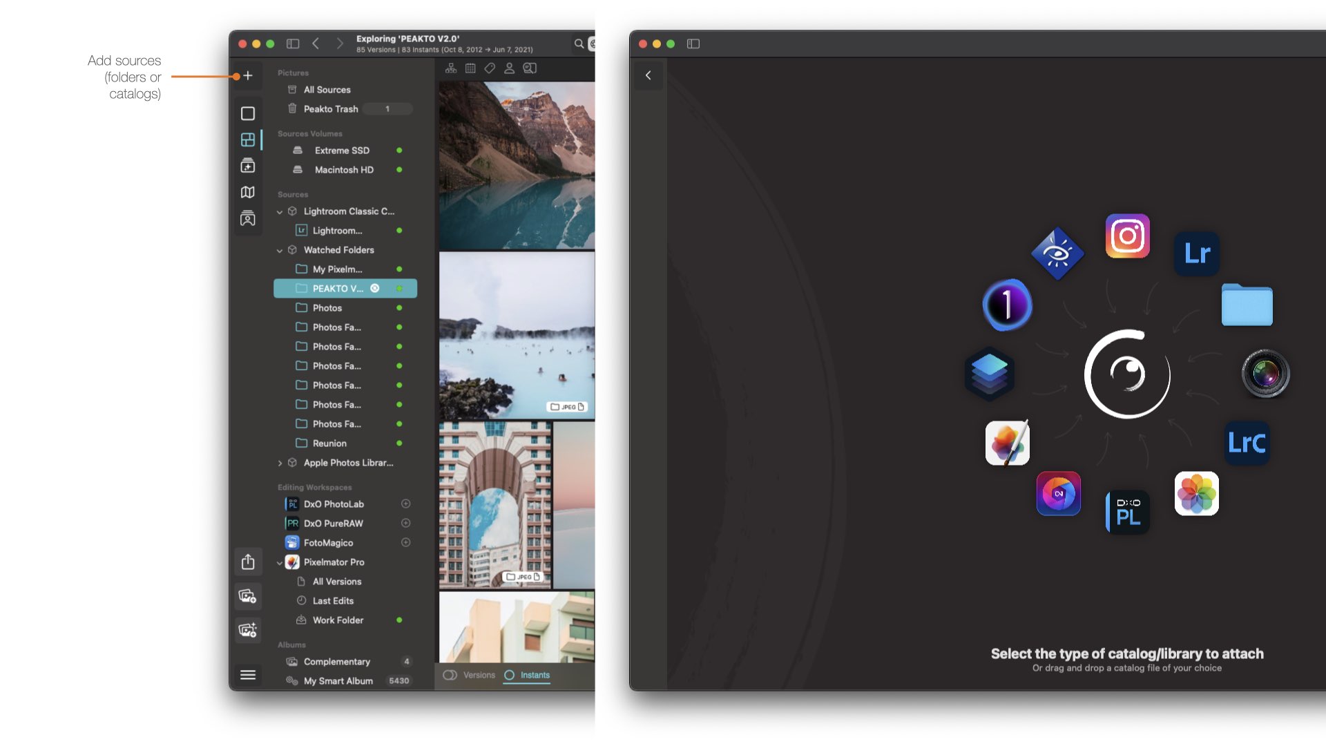 Note: you don’t need a running copy of these apps for Peakto to be able to open the catalogs/libraries as Peakto natively understands these formats. This is especially important for older apps (Aperture, iView Media) that do not run on modern Macs anymore.
