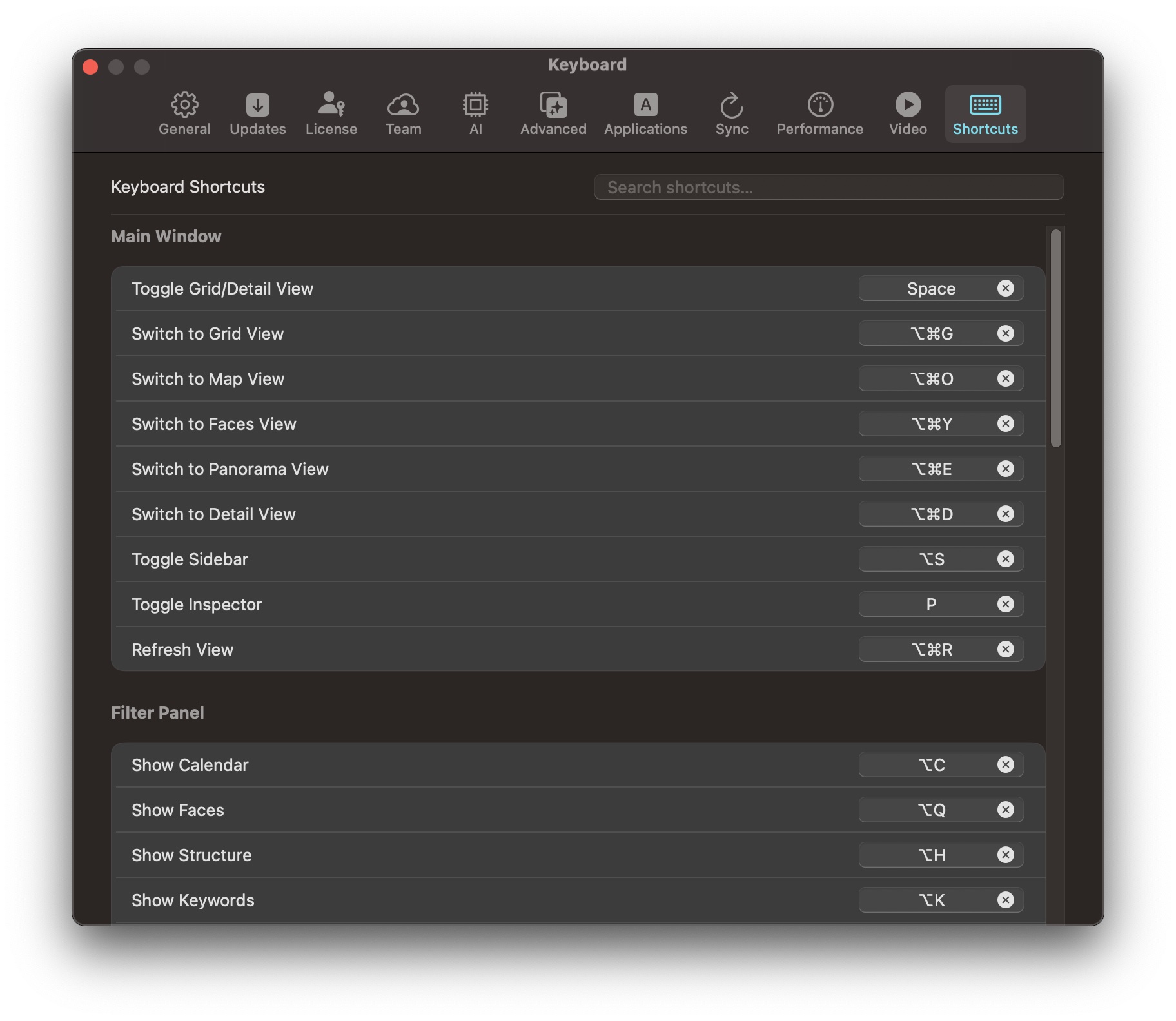 Since version 2.5.2 of Peakto, shortcuts can be fully configured in the Settings screen
