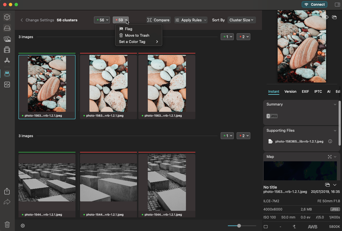 Ces outils vous aident à identifier rapidement les doublons, les quasi-doublons ou les images similaires, afin de décider lesquelles conserver, marquer ou supprimer.